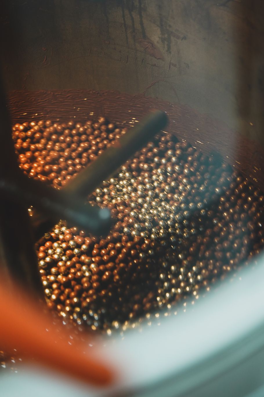 まずボールミルという機器。ボールミルとは、カカオ豆や砂糖などの粒子を、内部のボール(球体)で回転させながら微細なペースト状にすり潰し(粉砕・精製)、舌触りの良い滑らかなチョコレートを作るための機械です。日本のショコラトリーでは、「メランジャー(Melanger)」と呼ばれる石臼状の機械で同時に行うのが特徴的です。