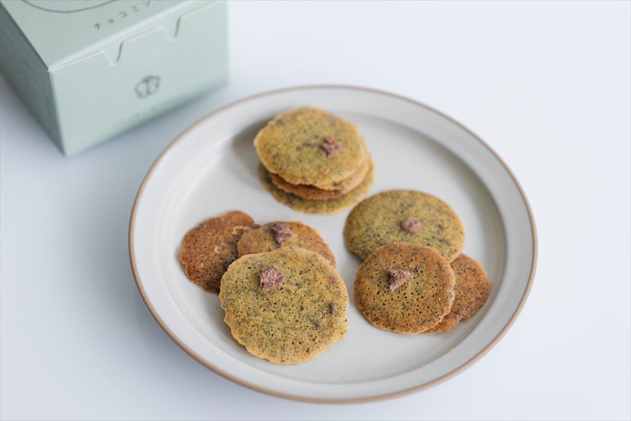 ゆのせん「チョコミント」は、国産のフレッシュミントと、世界各国のパティシエや料理人に愛されるチョコレートメーカー・ヴァローナ社のチョコレートを使ったひと品。小さなブラックチョコレートが浮かぶほんのり緑色のゆのせんは、せんべいともラングドシャとも異なる新たなビジュアル。