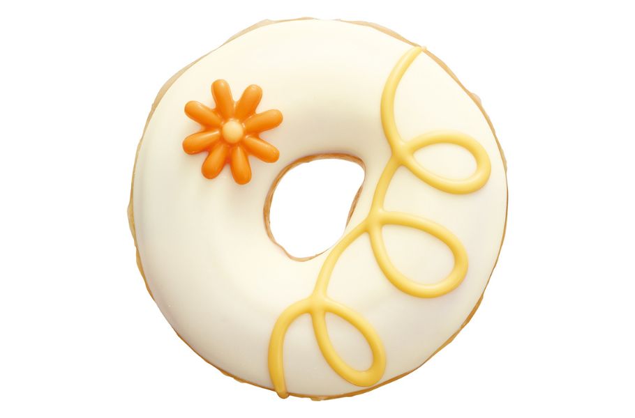 2024年も人気だった『リトル フラワー』は、今年も姿を変えて登場。ホワイトチョコレートで包まれたドーナツの上に描かれたぐるぐるのラインは、カスタード風味でコクのある甘さを楽しめます。仕上げにのったオレンジ色のお花はホワイトチョコレートでできており、心が和む優しい味わいに。