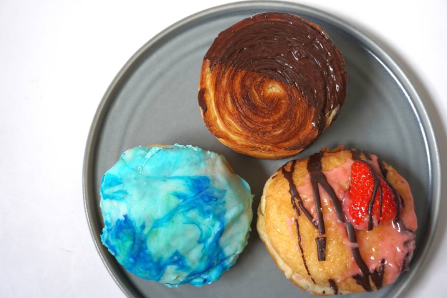 パン職人であった社長齋藤さんの得意なクロワッサンにチョコレート、抹茶、ストロベリーのチョコレートがかかっています。