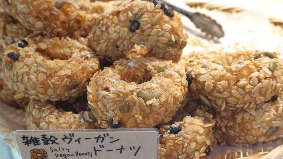 最後は「雑穀ヴィーガンドーナツ」。おすすめされて購入しましたがこれが大正解。ザクザクとした食感はきび、あわ、たかきび、キヌア、神山小麦の玄麦など、10種類以上の国産雑穀をぎっしり使っているから。噛み応えがあり、噛めば噛むほど雑穀と全粒粉の旨味が染み渡ります。塩がかかっていてあまじょっぱく、最後まで飽きません。食事にも合うからおにぎりのように食べたくなります。