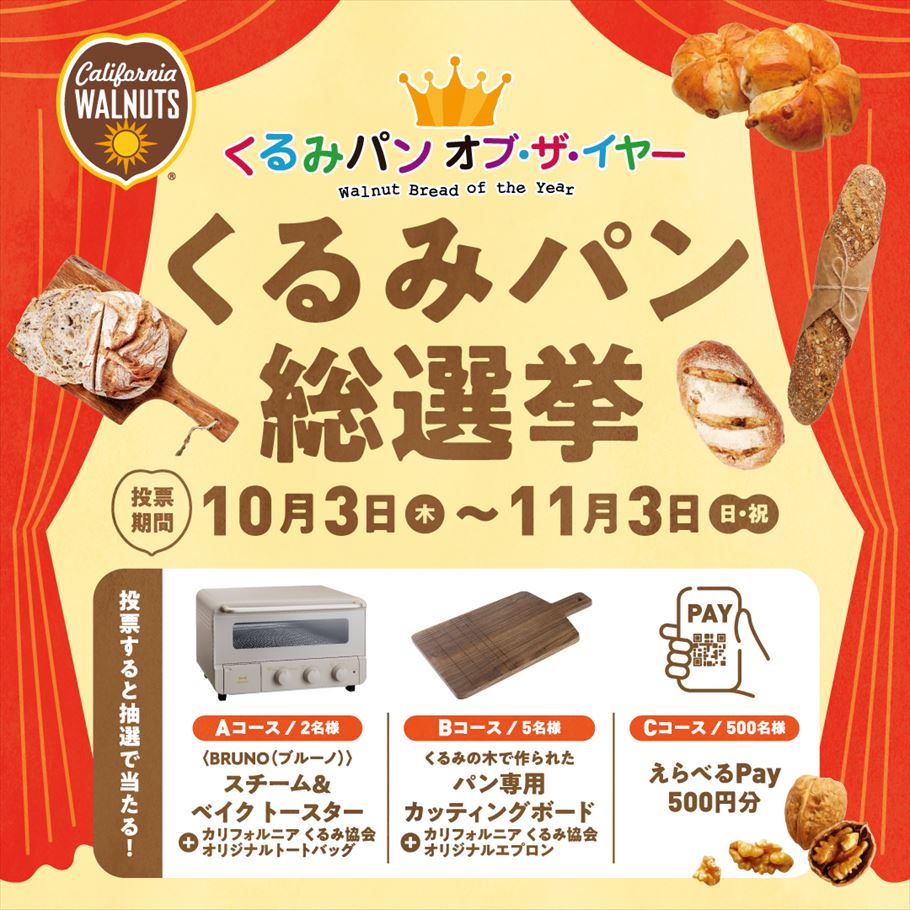 主催は、国内外に代表事務所を設け、カリフォルニア産くるみを広める活動を行う非営利団体「カリフォルニア くるみ協会」。大手メーカーから街のお店まで全50品のくるみパンが3部門に分かれてエントリーしており、1日1回、各部門からそれぞれ1品ずつ投票できます。抽選でプレゼントも当たります!