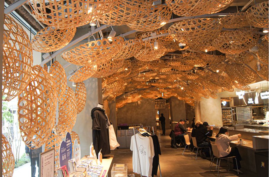 天井に見えるのは、嵐山の伝統工芸の竹かごです。総数なんと572個!一つひとつ職人さんに作ってもらったそうで、天井一面にびっしりと吊るされていて、まるで竹かごの洞窟のよう。