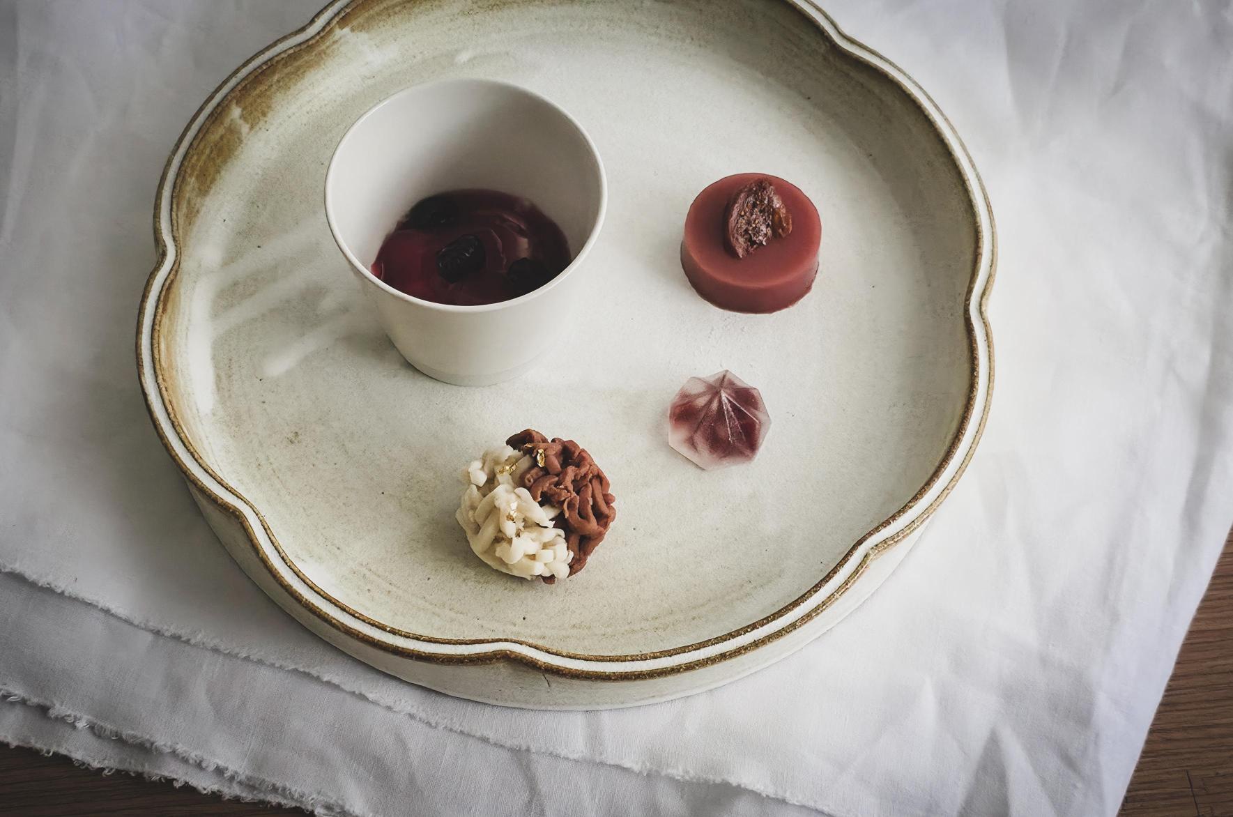 「茜さす」写真一番左上:明治 カカオグラニュールのブランマンジェに明治 カカオフラバノールとローズのジュレ、フラバノールとベルガモット、フランボワーズのソースと黒豆