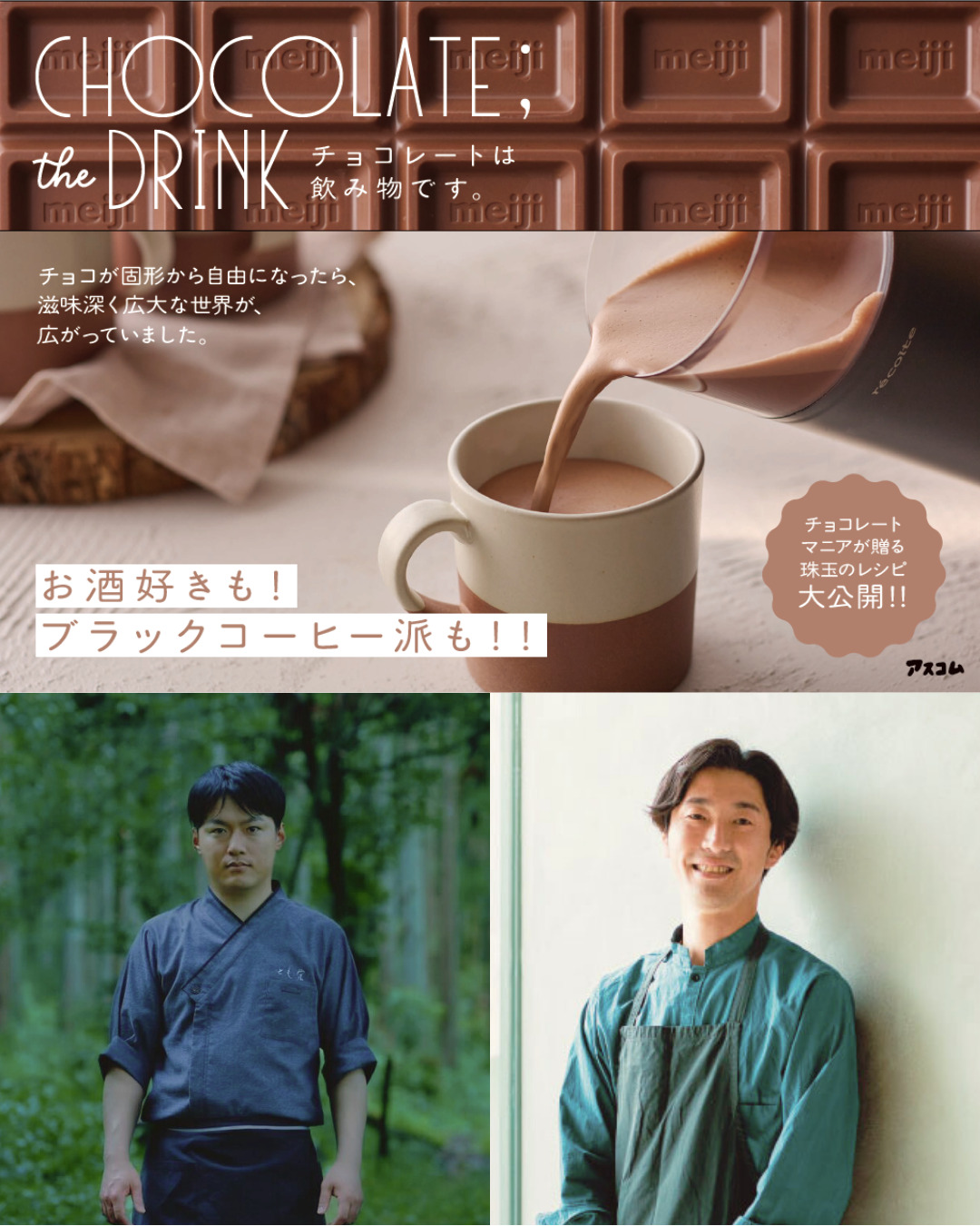 11月初旬にいよいよ出版される書籍『CHOCOLATE;the DRINK チョコレートは飲み物です。』発売記念イベントを開催。会場内で、今年の万博でも提供された抹茶のむチョコと、福井県の「昆布屋孫兵衛」の昆布シェフ、滋賀の老舗「とも栄」さんによる、特製和菓子のペアリングを楽しめるイベントです。チョコレートではないカカオ新素材を使った、先進的で洗練された新しい和菓子です。