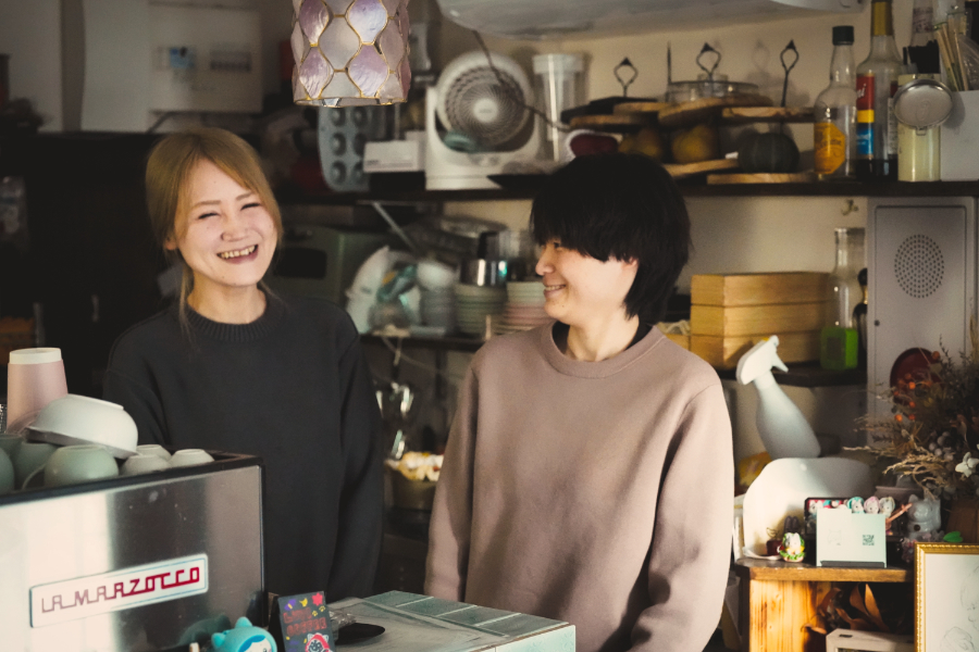 迎えてくださったのは、萩原千草さんと岡田唯さん。お二人の出会いは、萩原さんが以前働いていたカフェ。コーヒー好きの岡田さんがお客様として来店し、初対面で意気投合。萩原さんがお知り合いから譲り受けて準備をしていたこのお店で、岡田さんも一緒に働くことになったのだそう。