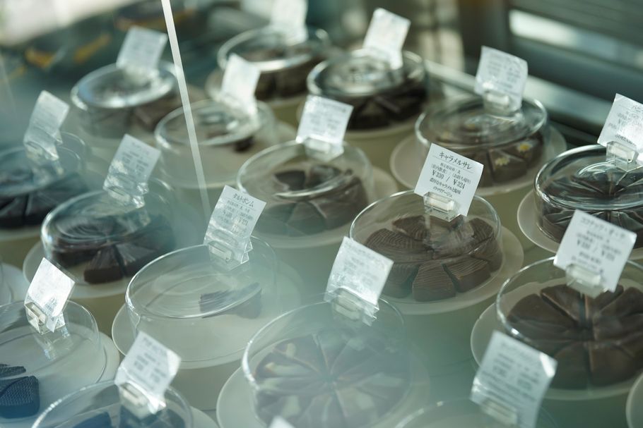 京都らしい雰囲気を醸し出し、料亭のような佇まいのお店を入ると、ショーケースには美しいケーキと、ボンボンショコラがズラリ。ボンボンショコラの数は、写真のようにここまでそろっているお店はなかなかなく、和の素材を組み合わせたラインナップが特徴的です。