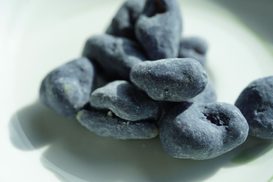 まずはこの青いショコラ「アンジェ」から。キャラメルガナッシュとヘーゼルナッツのプラリネをバタフライピーというハーブで青く着色したもの。口どけがよいこのチョコレートをどうして作ろうと思ったのか、水野シェフに伺いました。