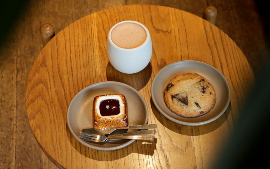 マシュマロに串を刺して、焼いて、クラッカーなどに挟んで食べられるそうで、それを美しくアレンジしたのがダンデライオン・チョコレートのスモア。