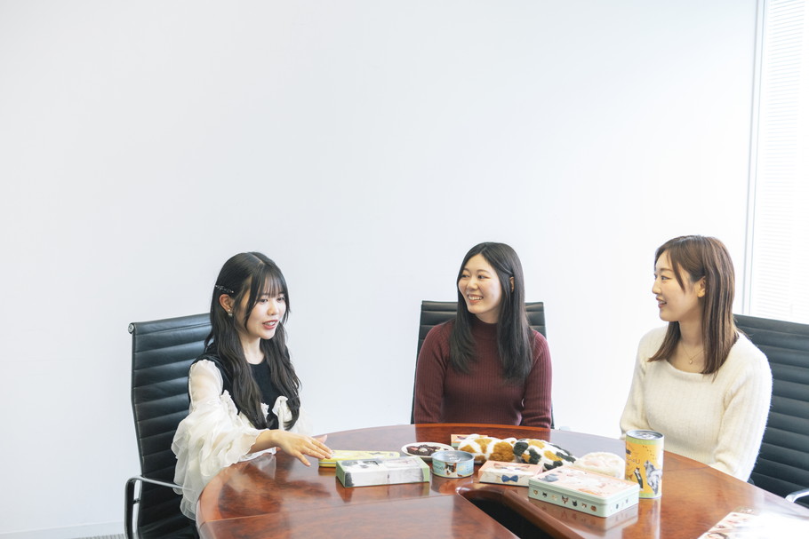今回は、「ねこみゃみれ」シリーズ商品開発担当の山根さん(中央)と菊柳さん(右)のお二人に、お話を聞きました。お二人とも、言わずもがな大の猫好きで「ねこみゃみれ」プロジェクトには相当気合が入っていたそうです。