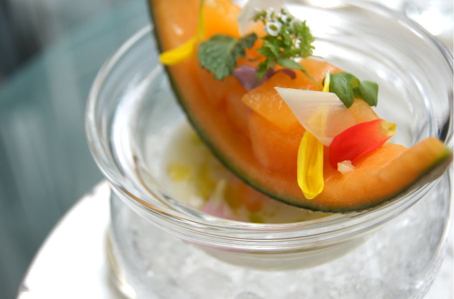 考案に携わったシェフたちは、エディブルフラワーやハーブをメニューに取り入れるのが得意だそうです。ただの飾りとしてだけでなく、メロンスイーツにしっかり苦味や酸味といったアクセントを効かせ、味に深みをつけていたのが印象的でした。お花やハーブは、ぜひ一緒に味わってほしいです!