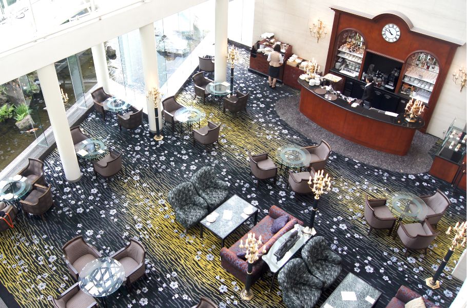 開放感抜群のラウンジは16卓58席。テーブルの間隔は十分にとられているので周りを気にせず時間を過ごすことができます。庭園の緑や池の鯉を眺めることができ、海外ゲストも大喜びなのだとか。