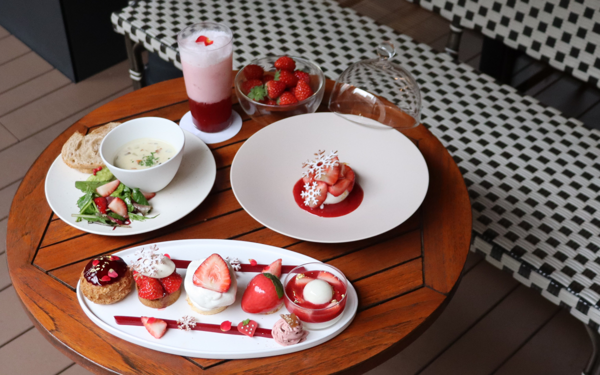 アフタヌーンティーのラインナップは、苺スイーツをメインに、苺を使ったサラダまで盛りだくさん!店内にはテラス席もあるので、天気が良い日は青空の下で楽しむなんてことも◎