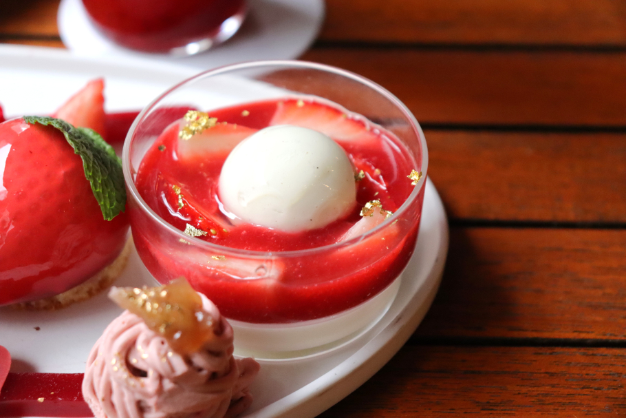バニラを贅沢に使ったなめらかなパンナコッタに、苺のソースとフレッシュな苺苺、そして真ん中には濃厚でふんわり食感のバニラクリームをトッピング。周りにあしらわれている金箔が、冬らしさを感じる赤と白の華やかさを引き立たせています。