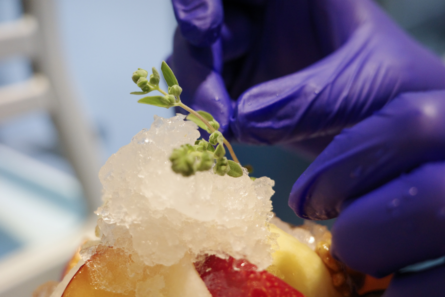 上のパーツは、視覚的にもひんやりと夏を感じることができる、レモンバーベナを使った「ジントニック」のグラニテ。
