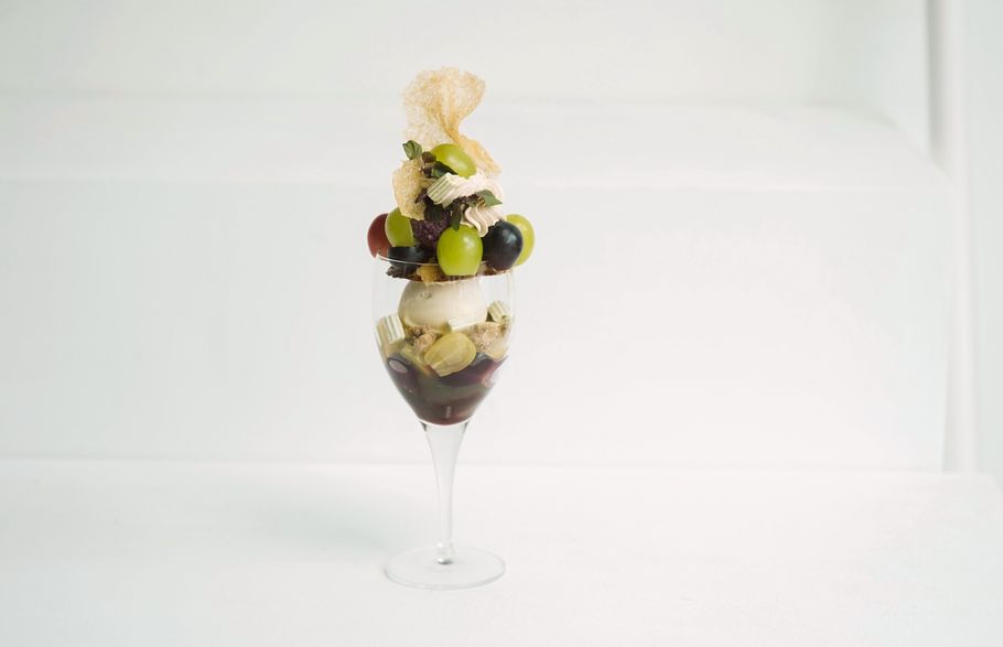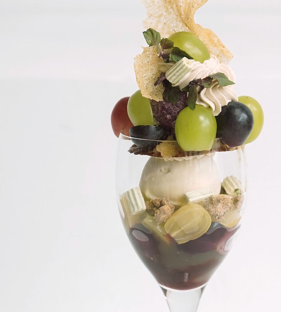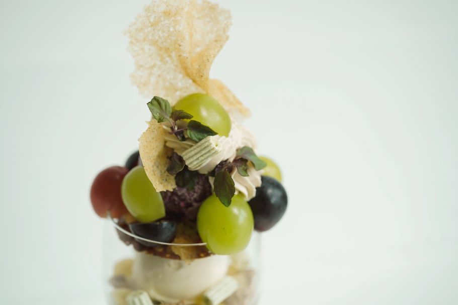今回の撮影時のパフェは今が旬のブドウを主役にしたパフェです。晩夏から秋への移り変わりを表現したくこれから町中に漂い始める金木犀の香りを合わせて季節を楽しんでいただけるよう構成しました。ブドウ自体はみずみずしいですが合わせる味わいをショコラブランにして夏のブドウパフェとはまた違った表情のパフェとなっています。」