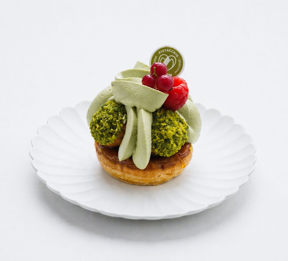 今回のピスタチオウィークでは全部同じではなく、“こういうだし方があるんだ”と思えるようなお菓子を出したいと思っています。写真のピスタチオのサントノーレは、ピスタチオとキャラメルの食感の面白さ、BABBIピスタチオペーストを使ってクリームと合わせたときの活かし方が表現できていると思います。」