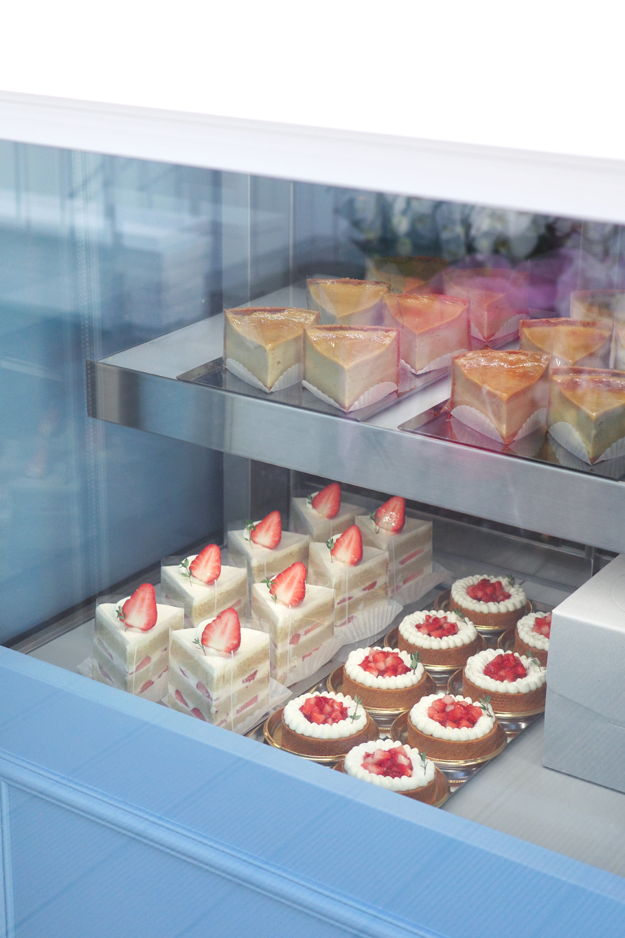 階段をあがると白い壁にブルーのデザインが映える店舗が。窓からは色鮮やかな生菓子や、さまざまな焼き菓子がのぞきます。